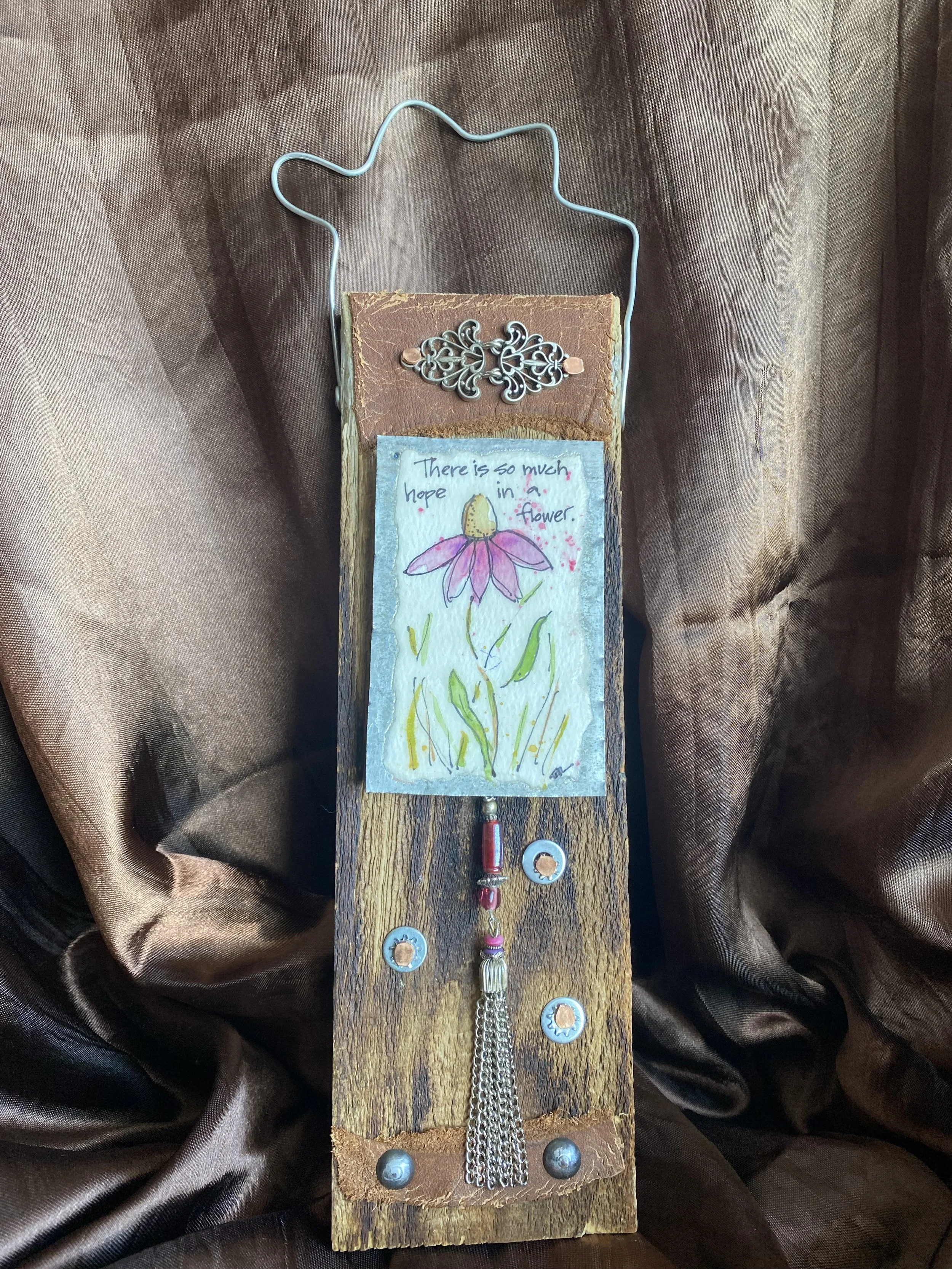 Our artwork is mounted on reclaimed barn wood, each board infused with its own story and character. The weathered grains and rustic textures of the wood add a charming, vintage allure, making every piece unique. The natural imperfections of the barn wood—like the subtle knots and weathered patina—create a beautiful contrast with the soft watercolor florals, resulting in a visually stunning and one-of-a-kind creation.